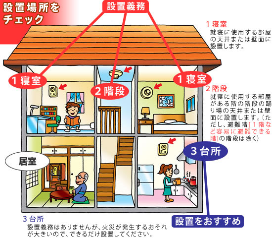 1.寝室 普段の就寝に使われる部屋に設置します。子供部屋や老人の居室なども、就寝に使われている場合は対象となります。