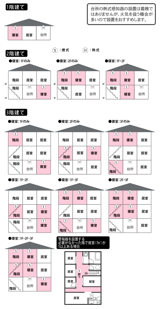 2.階段 3階建て以上の場合(2) 寝室が1Fのみにある場合は、居室のある最上階の階段に設置します。